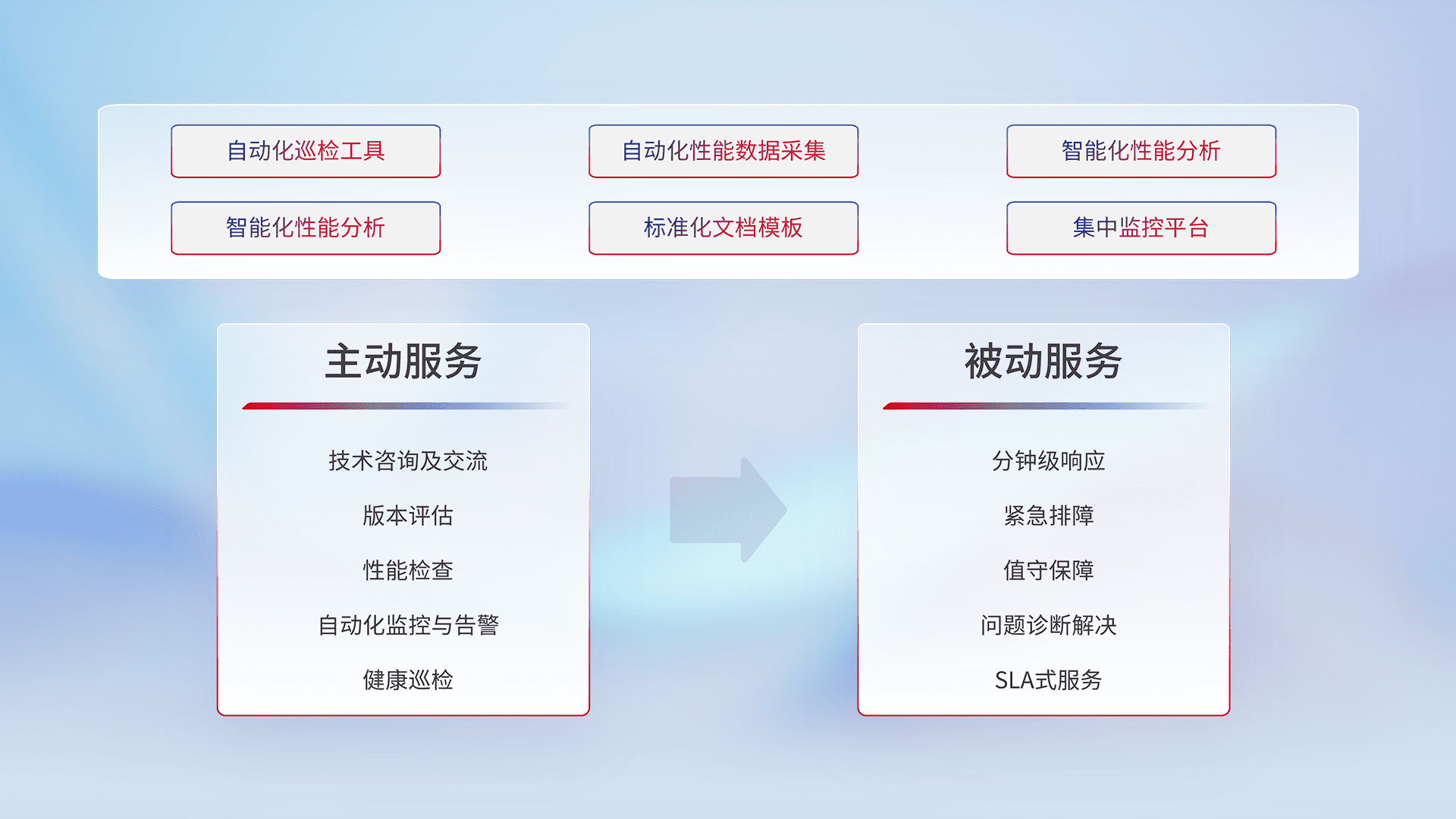 智能化工具和标准化文档,,,,保障服务质量,,,,提供主动服务(包含技术咨询、、版本评估、、、性能检查、、、、自动化监控与告警、、、、健康巡检)和被动服务包含(分钟级响应、、、、紧急排障、、、、值守保障、、、、问题诊断解决、、SLA服务)。。。